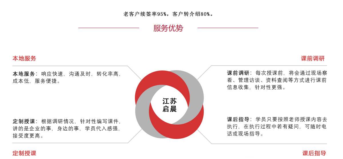 企業(yè)培訓>首選>江蘇啟晨!制造業(yè)的理想選擇!江蘇啟晨企業(yè)管理咨詢有限公司位于風景秀麗的江蘇省宿遷市。公司由國內知名高校及全球500強企業(yè)內頂尖的學者、教授、企業(yè)培訓導師、企業(yè)顧問等共同打造的一家專業(yè)的管理咨詢與培訓機構。公司專注于企業(yè)生產管理、現(xiàn)場管理、質量管理、安全管理、市場與銷售、人力資源管理、財務管理、班組管理、員工管理、內訓?�